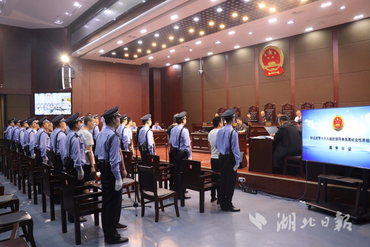 6月19日,武漢市蔡甸區(qū)人民法院一審公開審理了鐘某等16名被告人涉黑案。該案涉組織領(lǐng)導(dǎo)、參加黑社會(huì)性質(zhì)組織、聚眾斗毆、尋釁滋事、非法拘禁、故意傷害、職務(wù)侵占、敲詐勒索、非法持有槍支、偽造國家機(jī)關(guān)印章、非法持有毒品、販賣毒品等多項(xiàng)罪名。
