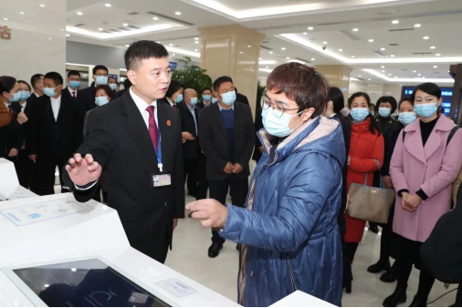 代表們首先觀摩了武漢市中級人民法院新投入使用的訴訟服務中心。訴訟服務中心充分運用現代信息技術和智慧法院建設成果,設置導訴、智慧服務、智助立案、智輔事務、智輔解紛、執行聯動等服務區塊,功能完備、布局合理、服務便民,是開放互動、智慧精準、便民利民、集約高效的現代化訴訟服務窗口。