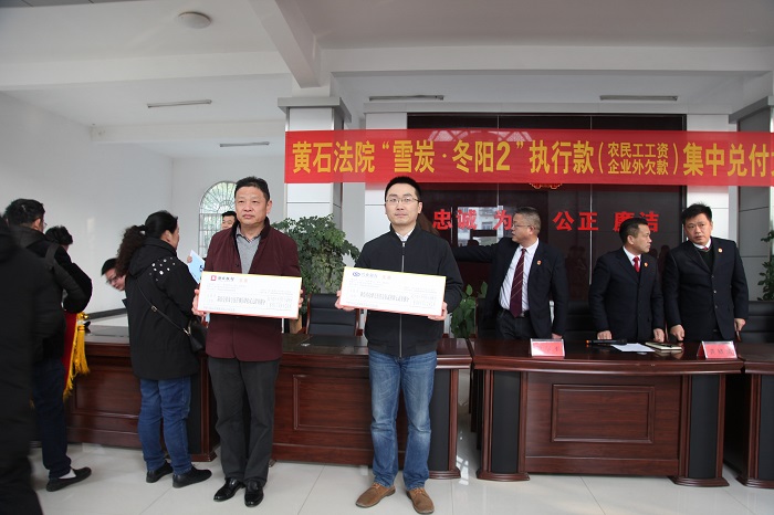 為讓申請執行人過上一個祥和如意的春節,臘月二十七,黃石法院開展“雪炭·冬陽2”執行款集中兌付大會,現場以支票、現金方式向涉農民工工資、涉民企欠款、涉金融債權等33案申請執行人當場兌付執行款5275萬元。